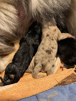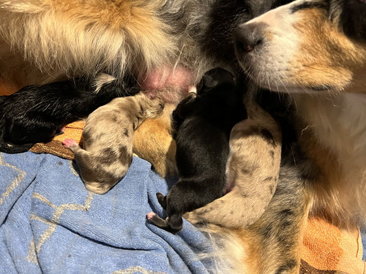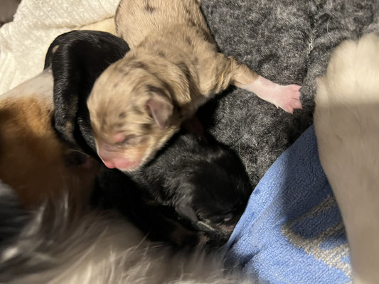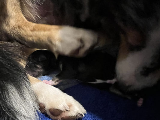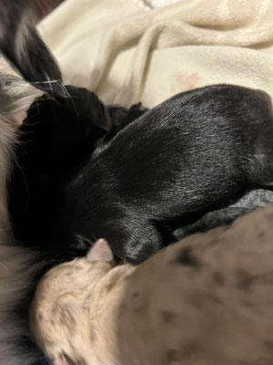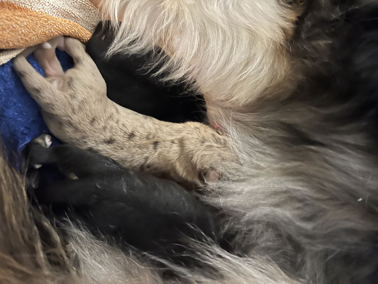 Ich fand ja, dass der 22.02.2022 ein tolles Geburtsdatum ist. Lizzy dann wohl eher nicht und sie ließ sich dann noch bis zum 23.02.2022 Zeit. Mal wieder den Temperatursturz verpasst (ich möchte ja meine Hündinnen nicht mit ständigen Einführen eines Thermometers in den Allerwertesten nerven), war ich dann doch ein wenig überrascht, als der erste Welpe kam. Ganz unkompliziert und recht zügig. Lizzy, für die die erste Geburt ein echtes Drama war, nahm es diesmal auch um einiges gelassener. Routiniert wurden alle Welpen versorgt und nach 2 Stunden waren alle 5 Welpen auf der Welt.