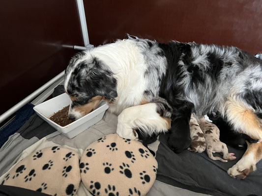 Vorbildlich haben die Kleinen nach der 1. Woche ihr Gewicht verdoppelt. Lizzy macht einen super Job und passt auch gut auf, dass keiner von der Hundefamilie zu nah an ihre Babys kommt. Für mich ist das völlig in Ordnung, weil es mir zeigt, dass mein Mädel ein ordentliches Brutverhalten zeigt. Ihr Wunsch wird von Mama und Oma auch in der Regel toleriert. Mit den Tagen wird aber die von Lizzy eingeforderte Distanz auch immer geringer. Die Neugierde meiner Mädels wächst, den Neuankömmlingen endlich „Hallo“ zu sagen und bei der Versorgung mithelfen zu dürfen.