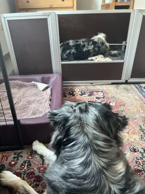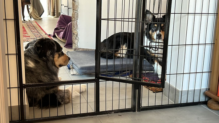 Neben den ersten Spielaufforderungen werden auch schon die ersten Ausbruchsversuche vorgenommen. Und natürlich wird fleißig das Bellen und Knurren geübt.